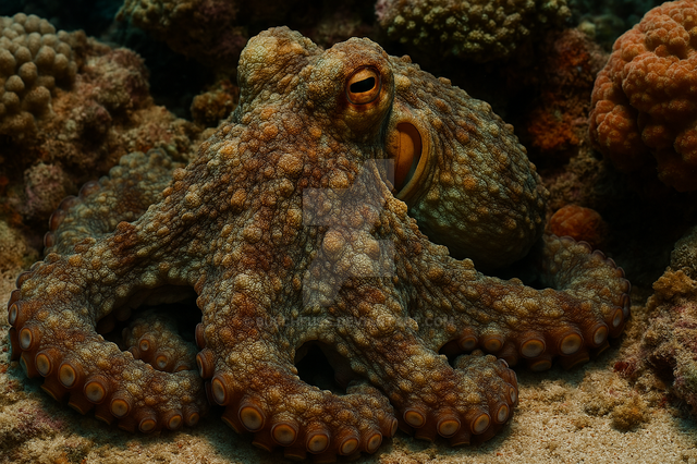 Prints: daniel-eskridge.artistwebsites…An octopus with an almost red and pink marbled skin moves among brown coral in an ocean shallow. The creatures tentacles whip around as it scuttles through the aquatic landscaped. The cephalapod turns its menacing gace upon you as moves towards you.