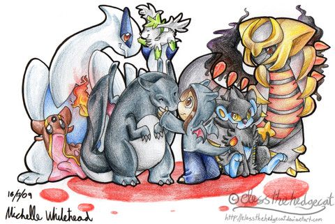 *sniffle* Beautiful and this isn't corny!!! I love how that you ca tell that Kaisai and Pika are old. Love the shine on Houndoom's horns.