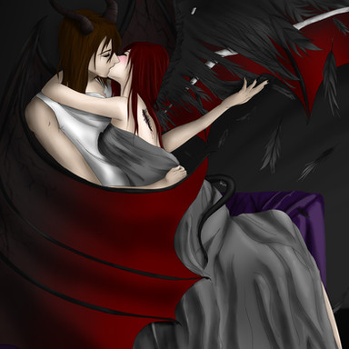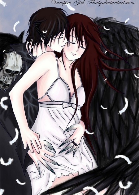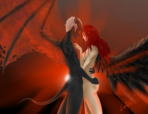 The way you always play with light and shadow is stunning. I love the simbolism of her wings and how the dark essence is floating around him, half forming his clothes and wings *____*