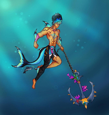 Orphaned at a very young age, Reef has always been an outcast. Shunned by others for his limited use of psychokenisis (a gift which all merfolk are born with), Reef has had to develop a harsh front to deal with others. Ever the ruffian and scrapper, Reef lives by the code of "survival of the fittest" and gets into fights constantly with others. To make up for his lack of psychokenisis, Reef has trained hard on his physical prowess, which is constantly put in check due to the ocean being a cuel place to live. He's an expert harpoonist and has access to multiple weapons. He also wears a gauntlet fabricated to enhance what little psychokenisis he has, but it's only strong enough to reclaim his harpoon once he's thrown it. Furthermore, some believe he'll never learn to master psychokenisis since he relies on the physical side of his strength nearly 100 % of the time. Though Reef has a grumpy, harsh exterior, underneath it all, Reef really is gentle at heart and merely wishes to be accepted. He lives with his girlfriend Coral, the only other who seems to care for him in this world. His dream is to join the Vanguard, but he has been denied multiple times, due to his lack of psychokenetic powers. Random Factoid: Reef is quite the singer!