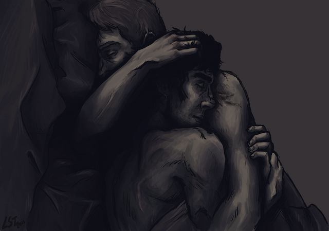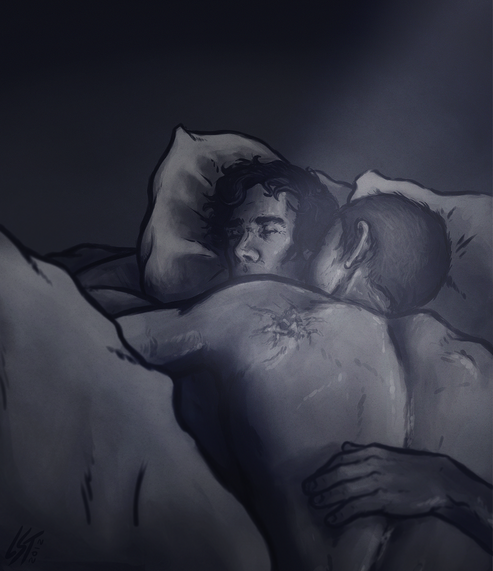 This is absolutely breathtaking. I've never commented on DA before, I don't think, and I might not again, but I had to let you know that this drawing makes my heart *ache* for someone to hold like that; for someone to hold me like that. It's beautiful, how the blanket is just folding around them to keep the world out of their orbits, and ugh. Oh god. *crying grossly* Thank you.