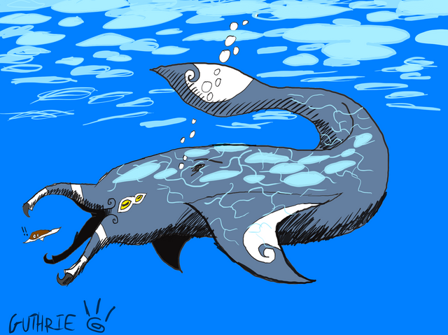 "A Baracule's main body is a small, cylindrical object with some resemblance to a sausage, and houses a compact collection of organs, the largest of which is made to continuously intake and shoot out water, propelling the entity (and its massive jaws) like a squid."