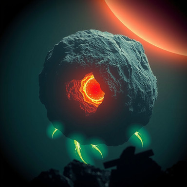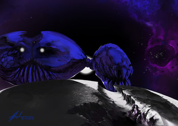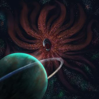 Daedrellum are few and far between. Though they are a rare sight, passive species, and prey to many other space-faring entities, Daedrellum are successful simply because they exist in so many areas that it would be near impossible for any species to track them down. Daedrellum have a physiology that cannot be traced back to any planetary life, suggesting that the species originated in a vacuum or asteroid. Yet to beings of earth their behavior can be described as a cross between animal and fungal organism. Daedrellum exist in two stages: the spore stage and the "latched" stage. In a spore stage the Daedrellum is only an insignificant mass of particulate matter, so small and simple it can survive in its spore form for centuries without biological decay. If it ever runs out of energy reserves, it simply wakes up, absorbs passive space radiation, and becomes dormant once more. Once the spore hits another object in space, the spore awakens, sends anchoring dendrites into the rock, and begins to grow on a combination of space radiation and whatever mineral material can be found in the rock. Chemical reactions inside the creature at this stage give it a gentle red glow, whiter towards the center.Over time the red Daedrellum mass will grow in size and develop a sticky texture that causes other spacial debris to attach. Eventually it will grow a shell, exchanging oversized or undersized rocks with better sized ones to cover its highly regenerative but vulnerable body. At an even later stage it becomes sufficiently complex to develop tendrils, enabling it to engage in limited locomotion... and better grab at nearby objects of interest. Even in this stage Daedrellum tend to be nonthreatening. They will opportunistically catch and absorb nearby small lifeforms, but they are highly visible and will not chase spaceships or other fleeing creatures. Additionally their prey of choice is of much smaller relative size: to consume a human, a Daedrellum must have a diameter of at least 2 miles, and even then rarely take the opportunity. Extremely large Daedrellum may eat larger lifeforms with relish, but only those ignorant enough to get within range (they ARE bright pulsing masses of rock and organic matter after all).