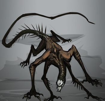 This semi-quadrupedic entity follows the tide of winter, visiting long after the dead brown leaves are cast in snow. The unwary may mistake it for an odd beast, but its physicality is a deception: the "beast" every bit a force of nature as it is a living construct. As such, it is not entirely bound to the rules one assigns to biological hunters. It is not merely a denizen of the frosts, it is attuned to the frosts. It does not dwell in frigid lands because it has evolved to do so but actively seeks them out because the frozen bleakness empowers it. It wields weapons both intuitive and arcane, acts as both hunter and wraith. Its reputation has earned it a nigh-mythical status with those who've seen it. Some call it aulth'wyuui, the "winter soul" - a wandering echo of all who've succumbed to hypothermia. Others know it as "the cold ferryman", a sub-agent of death in a symbolic form. Most think of it as only a frigid bogeyman, acquiescing to the idea they'll never know anything about its origins. To these people, the creature is simply "The Shiversnatch", because that is what it embodies and that is what it does.