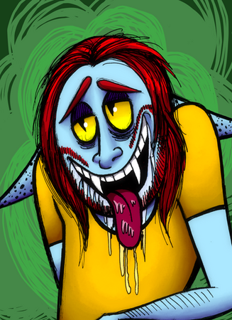 Overall, this is a very impressive piece! The expression and pose is very dynamic, the contrast is generally very well executed, and the exaggerated anatomy is striking! It's quite a revolting piece in a good way, and it makes the viewer very uncomfortable when looking at it. So let me cut the crap and get to what you're probably here for - what can be improved? While the piece is very strong overall, I think there are a few aspects that could be improved. For one, the colors are a bit weak. I think the blue of the eyes doesn't form enough contrast agains the purple tones - teal, or even something more yellowish could've worked better. The blonde hair could've been made more vibrant so that it looks less natural and more eerie, and it could've been rendered with more solid strokes and less lines. Aside from that, the background could have more interesting contrast, but that's it! Very well done.