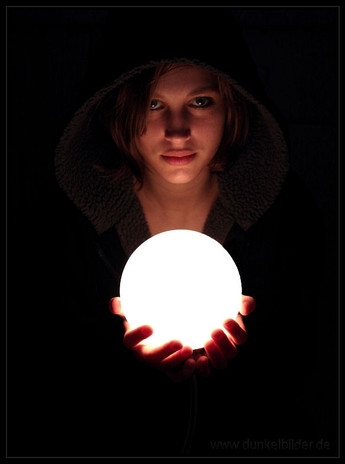 on the other hand, i think this photo would have been more effective if you looked straight at the camera with a serious face, and sort of with your head down just a little bit, to illuminate the light from the ball to your face, and your eyes, giving it a more magical appeal and more emphasis on the theme. just my thoughts still a good photo. a great idea actually.