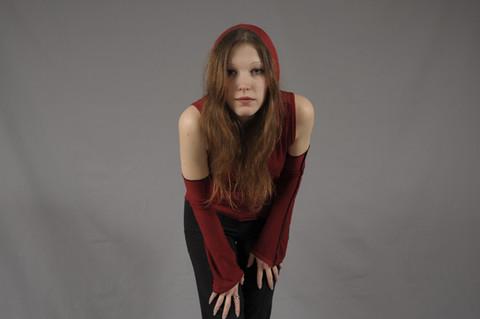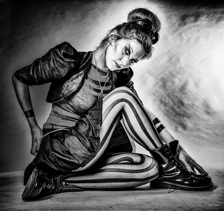 First impression of this pose, clothing, hair and face reminds me of Janis Joplin.