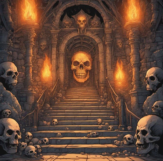 AI generated image, using DreamStudio, to illustrate "Turn of Fortune's Wheel" (ToFW) adventure for D&D 5e Planescape setting.Mortuary basement.