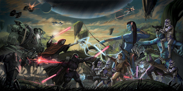 The picture is certainly well drawn and impressive. On the other hand, I really don't like this sort of match-up in Star Wars. Jedis are so insanely super-hero godlike strong. Who wouldn't expect them to win against an imperial army - and were it twice the size of what's depicted here? The poor Empire could have a bunch of at-ats to assist them plus super star destroyers and swarms of ties in the sky and they would not really stand a chance.