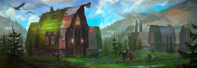 Earnest depiction of buildings and landscape appearing as one entity.Β Β