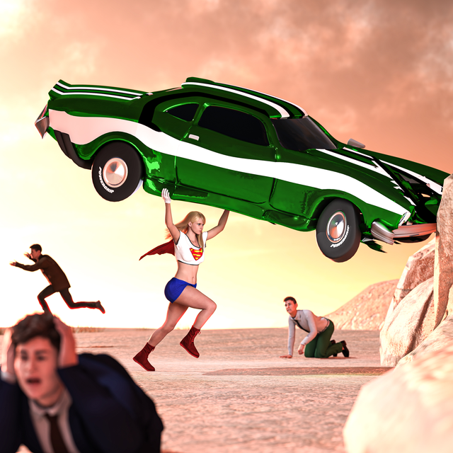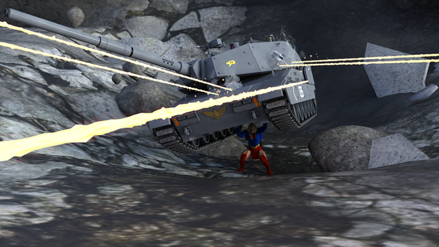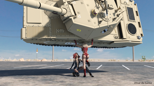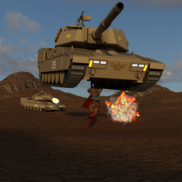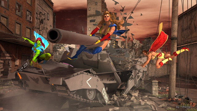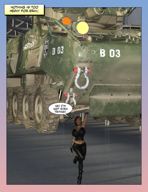 ...and from that it's interesting to know that Kimberly/Olympic Steele may partly come from it. I think a lot of people create characters to help them think about issues of interest/concern to them, Cracovia certainly has some of mine. Very cool to see Kimberly doing feats of awesome. Hey, it seems to be national tank-throwing month: Michelle, then Cracovia, then White Owl watching Cracovia, now OS I'm sure than tank had it coming...that crumpling breaking-apart effect looks great.