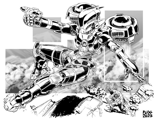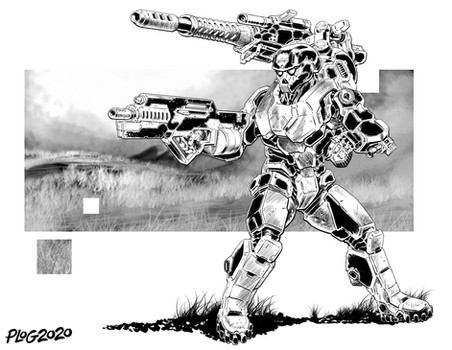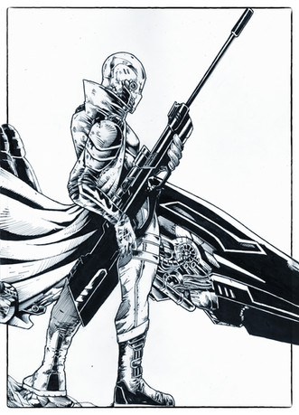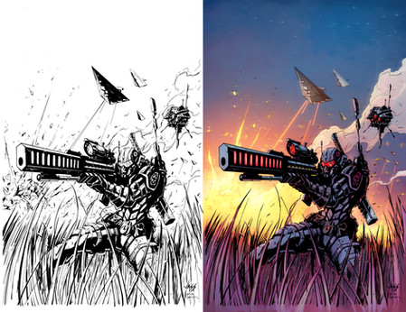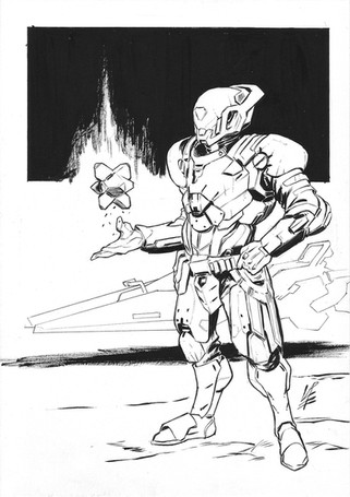 Really awesome inks, Nicole!Β Looks like your father artwork style, very detailed in all parts. Great job with rifle, explosion and the particles.Β Of course the agent and the droid looks awesome.