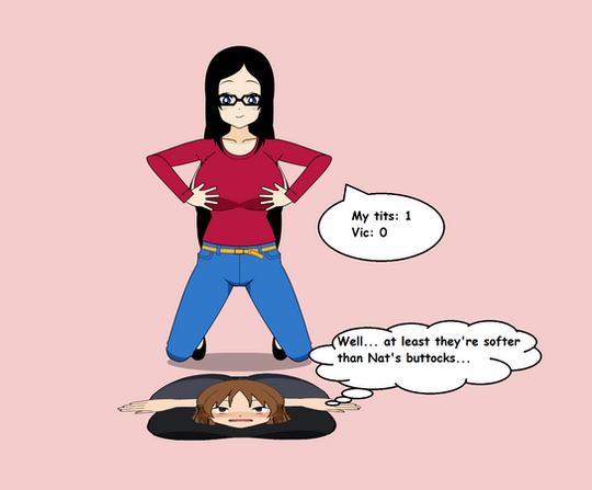 Probably not, Her boobs would break the machine first! If Nat was to pick Vic up like that, she could swing Vic around and smush them with her boobs! They're literally bigger than lilith at this point anyway. Nice job with this one, man.