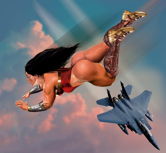 My particular vision of Wonder Woman. The body proportions are exaggerated deliberately to enhance the effect of the pose from a viewpoint located below the hips. The muscles of the back and arms have also been increased. I used different layers with the lights and reflections for the greatest effect of sunlight. In the boots I used three layers depending of each group of tones and shines. The air squadron adds power to the composition. Painted in Photoshop CS3.Related content