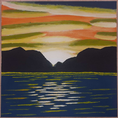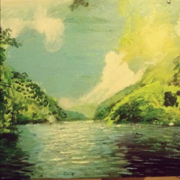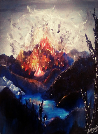 Painting- Landscape with mountains and clouds and a reflection of them in water