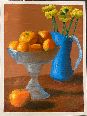 Pointillist painting- Series of tiny paintbrush dots in blue and orange only.