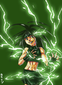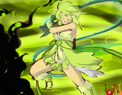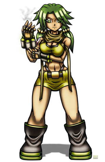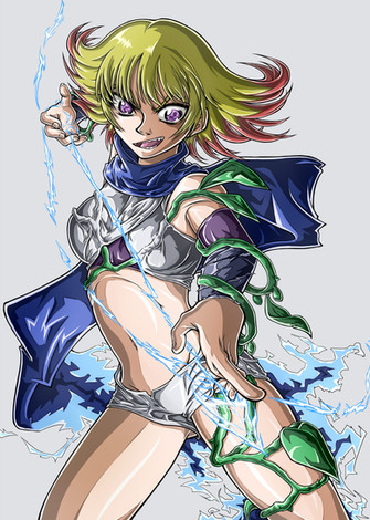Green Silk, the Chemical Queen. Very intelligent but unpredictable and crazy as well. Her power is the total control over chemicals and chemical reactions (and therefore genetic, even her own). She is the only one from Unity Corp without any white color on the costume (and one of the two without cape). She is also the only one without natural flight-abilites (except she grows wings). Also she is the only one who can be affected by her own powers (if she wants to, like genetic manipulation). Because of her ability to produce and secrete all things of stuff and analyzing chemicals just by touch, she wears nearly nothing and walks barefoot.Also nobody knows how old she is. The "Unity"-powers extend life by nature but because of her chemical power she can nearly exist for an eternity and young as she desires..