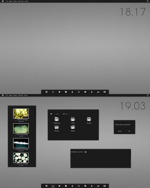 Improved version of my past concept: fav.me/d5f7kfwAlso a reworked version of the top Panel, now instead of the username you get a clock, when the cursor hovers over it it "rolls" to display the username. The file manager now displays the file's timestamp and it's permissions.