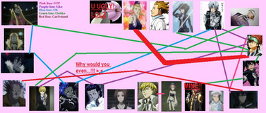 Next to that is a persons profile: It stands for my love of physical deformities. Round monster eyes, scared faces, fangs, no mouth, no face at all, no ears, no nose, no eyes, clawed hand and feets, ripped up bodies, cut out tongues, longs huge never healing wounds, giant holes and birthmarks. What can i say, my characters are always interesting. After watching anime for about a year im obsessed with making my characters unique. After seeing the arrancars holes and blood+ monster hands as well as many others, i have had a strange compulsion to give them uniquebodies of their own.