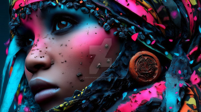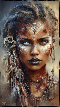 #portrait #beauty #warrior #digitalpainting #fantasycharacter #blueeyes #braidedhair #digitalportrait #facecloseup #fantasywarrior #tribalart #vividcolors #warpaint #womanportrait #artisticmakeup #exoticbeauty #tribalbeauty #realisticillustration #detailedartwork #ethnicstyle #stronggaze #colorfulheadscarf #dawexclusive