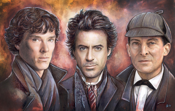 Sherlocks from left to right, Basil Rathbone (1939-1946), Peter Cushing (1959-1968), Jeremy Brett (1984-1984), Robert Downey Jr. (2009-), Benedict Cumberbatch (2010-).Related content