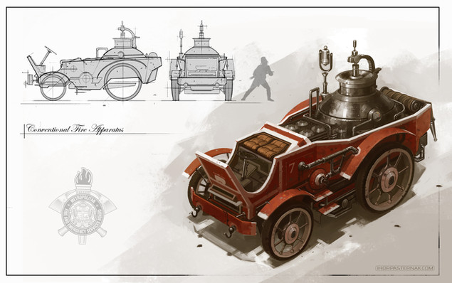 #big #bronze #bug #hose #red #steampunk #tank #water #wheels #fire #firefighter #illustrator #vehicle #conceptartrt #gameartconcept