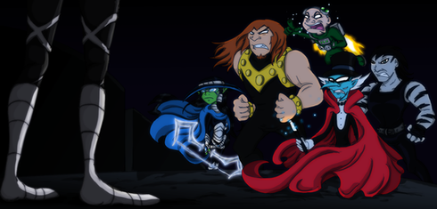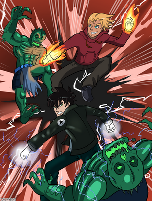 Just a cool battle scene I whipped up. A 3-on-1 fight against some magically-powered villains is never a fun time.Art © Devicon