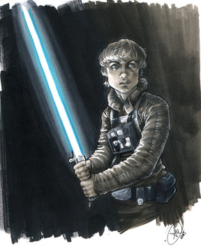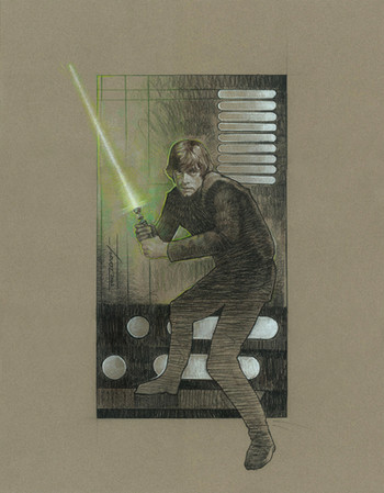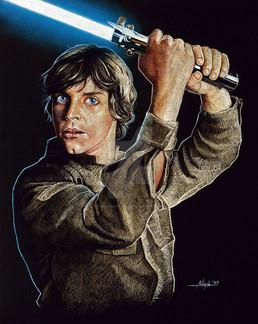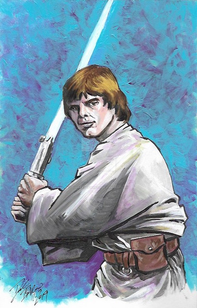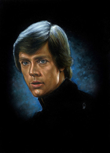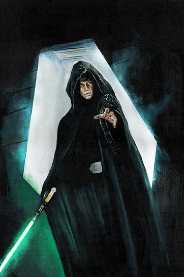 Wonderful painting, with excellent texture and likeness (Mark Hamill is so difficult to portray, isn't he?) and interesting use of color and obscurity. Green and black is a personal favourite color scheme of mine. I also like how all the detail on the full-body image is in the face and hands; it is as if his humanity has been drained away by the Vaderesque black cloth, and only some emerges from the shadows.