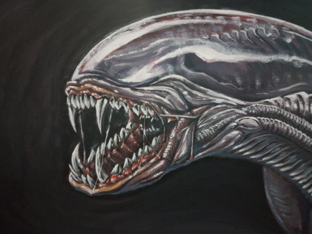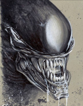 A xenomorph I did in white paint on black card which serves as a background for my personal study...The study was on the work and surrealistic style of HR Giger (This can count as a small tribute to him)