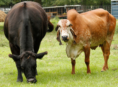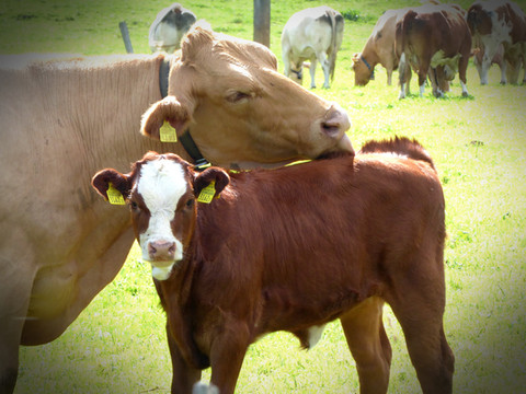 Betsy has her yoga moves down!herd life - baby llama in background and baby calf in foreground. happy texas!