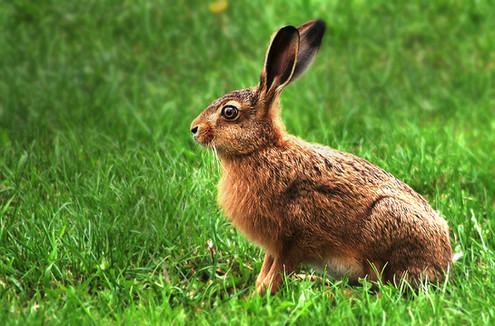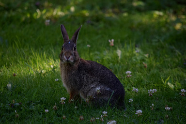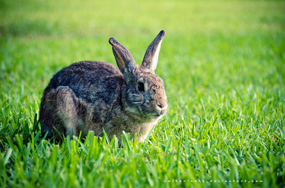 Sweet bunny in the yard with a torn ear pondering the bright side.mary