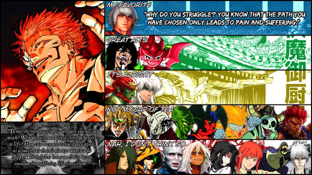 NOT A FAN: Akuma (Street Fighter), Obito (Naruto), Stain (My Hero Academia), Shinra (Fire Force), Cell (Dragon Ball), Yujiro (Baki)