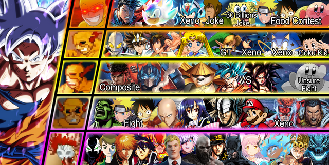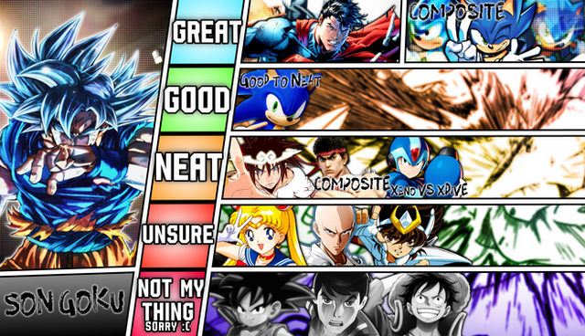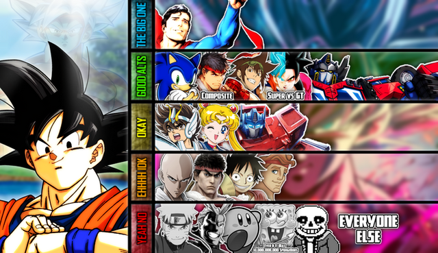 Meh...: GT Goku (Dragon Ball), Naruto (...), Saitama (One Punch Man), Luffy (One Piece) (For Kid Goku), Archie Sonic (Sonic The Hedgehog) (For Xeno Goku)