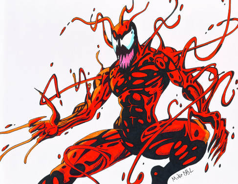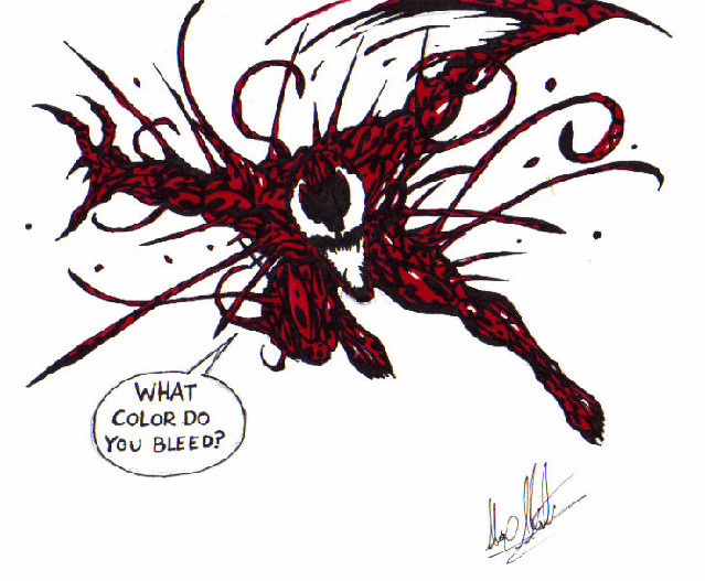 See, Comics Carnage at his best is the anti-thesis to Adult SPIDER-MAN. He is not supposed to be used often as he is a BOSS type villain (the BOSS villain of Michelinie's run in fact...) and ideally is the polar opposite of Spider-Man. One wants preservation of life, is mature and has loving family, the other relishes termination of life, is immature and desires family. Cletus is also playful to a fault and excessively arrogant, which usually leads to his arrest and failure in his initial run. The best way to describe him would be if Child Play's Chucky was mixed with the xenomorph.