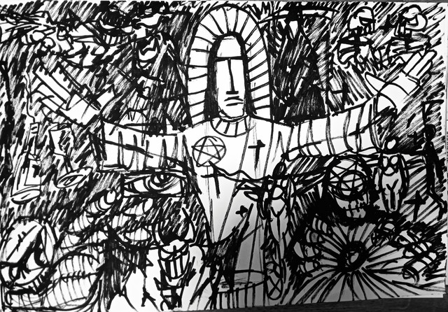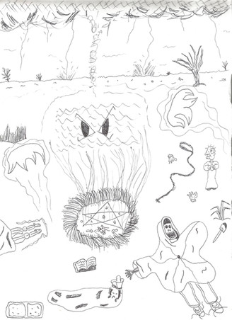 Somehow, you depicted God as Alfred E. Neuman. And some of the gesture-making hands in the lower part of your picture look awfully familiar.