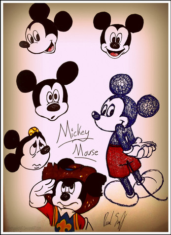 This is his first design used on "Plane Crazy" and "Gallopin' Gallucho" and "Steamboat Willie" . The third one is the most memorable and maybe that's why people always cite it as the birth of the Mouse (Well it isn't , it is the 3rd really ...) . It was the first animated short to have sounds , so I guess it had something to do with that. Then again, this cartoon is also one of Mickey 's best : he is a mischievous little prick who turns a goat into a phonograph (then again the goat had it comming! It ate Minnie's instruments and partition ...) , throws away a cat by the tail and plays drum on a pig's tummy (that is after kicking the piglets away). While this Mouse is very fun to watch (thanks talent of animator Ub Iwerks), he is still an embryological creature. We still have to wait a certain time before his actual refinining .