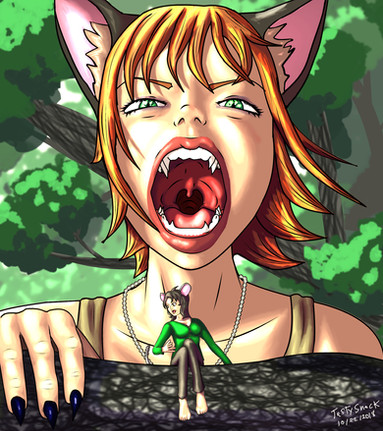 Tallena quickly swung open the door and there stood Tallenaβs longtime friend Moxy. She looked very tired with bags under her eyes, she had shoulder length frizzy orange hair and very fluffy orange ears her left ear had a large black spot, her tail was orange as well, it too was very fluffy, looking more like a three foot long orange ball of light cotton candy, than a cat tail. Moxy was wearing a work uniform from the diner that she worked at, it was a white and red checkered pattern with a skirt that matched, and she wore black work shoes. Moxy was slightly shorter than Tallena, but she was more on the heavy side. She had wide hips and a plump belly that pushed out the front of her tight fitting uniform, it looked like it was made for her when she was a few sizes smaller. Tallena understood that her overworked friend had little time to exercise but it looked like she had been helping herself to lots of greasy dinner food, she had gained weight over the past few years. She carried a small white hand bag, she cradled the bag with both arms almost like it was very valuable to her, and she was afraid it could be snatched away at any moment.