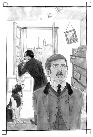 Woohoo! Down to the last tenth of the comic. Here Lestrade is hatless while in the train. The original illustration of Sherlock and Watson in a train indicates gentlemen had hats on while on trains, but I say Lestrade was hot, or had the hat as a foot stool... I dunno. The point is, two less hats to draw.The parlour game mentioned is an actual parlour game from the late Victorian era, a game you could only play once. Bet they couldn't wait for someone to invent the internet..
