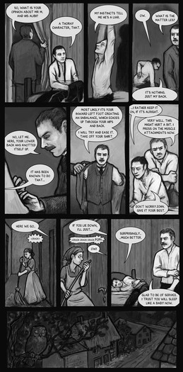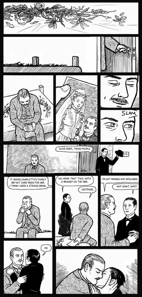 Oh my goodness. I just went throught what must be my fifth or sixth complete re-read of this comic. (A few are missing in your comic's folder by the way.) Completely stunning work! I really can't wait for the last few pages, though we Holmes fans are a very, very patient bunch. (I am a little sad knowing that we only have about 5 pages to wrap everything up, meaning we probably won't see Mr. Holmes reaction to John and Ghislain's new relationship.)