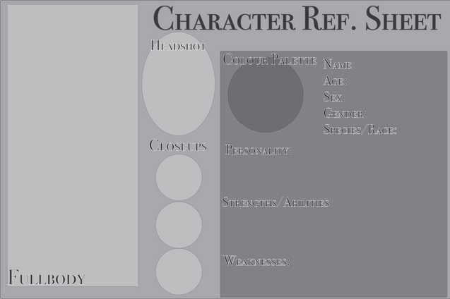 Detailed Character Sheet :This is something I did to start off my characters, both main and small. That way I won't be at a loss later down the road. Not only that, but it helps to flesh out your characters a little bit. It's available as a Photoshop Document, and the colors and text are completely customizable.