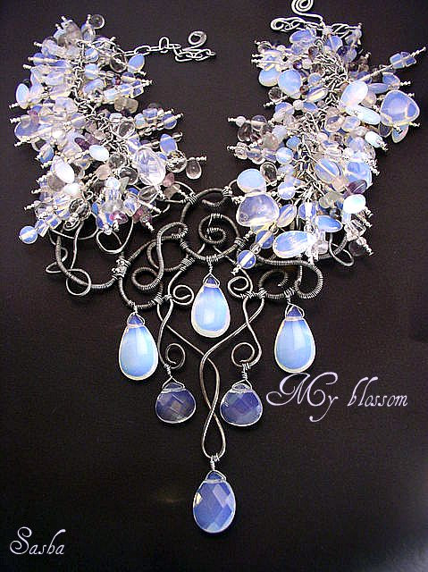 Very pretty, I like how the wire swirls around the glass and it's worked into a chain like that.