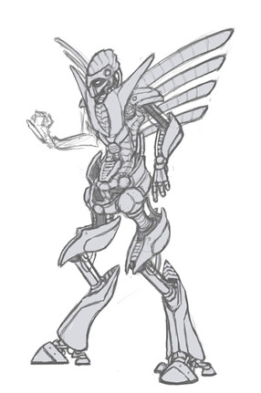 the character is simply amazing, well designed and presented, seems to me like a great combination of robotic and natural forms....I might want to see this character in a background more fitting to its design though...still amazing work (rock)