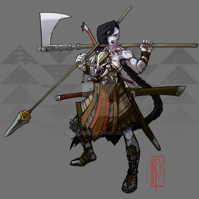 Thanks so much! I wanted her to have a meaty warcraft style axe instead of say a sword or spear. It's really the lines doing all the work in place of crazy realistic detail and texture. It was really cool trying to find places for the snake motif theme and when the axe started to look like it could be a metal worked snake, that was the icing on the cake. ^^