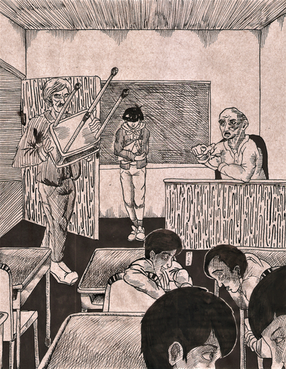 At a first glance, this reminds me of something that Tim Burton or the creator of Salad Fingers would concoct. It's absolutely brilliant and really drew my attention. The style, in general, is something that is entirely unique from just about anything that I have seen in the year I have been here on this site. Not only that, but the colors are oddly smooth and appealing to the eye, which also adds a layer of mystery and abstractness to the whole piece. Not only that, but the shading is really cool. It adds a form of depth and form to everything; it helps to establish the piece. And, my final standing remark is that the people in general were drawn very well.