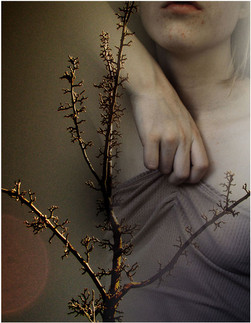 I like the way the ring shines, and thus being the only clear thing in the picture. Now comes the fun part. Although it should symbolize love, commitment, marriage, put in the orange tree as a good material life, the rings feels like a cage. Because of the metal, it rings cold, dead, a prison for the finger, which ultimately becomes a prison for the heart. She's all stripped of her clothes, of herself, and this is the "naked" truth - once I take this ring, everything is going to change (new clothes, new way of life, maybe even losing the power to love). Is she going to give up herself for the little rich orange tree, for a hot sun and warm life?
