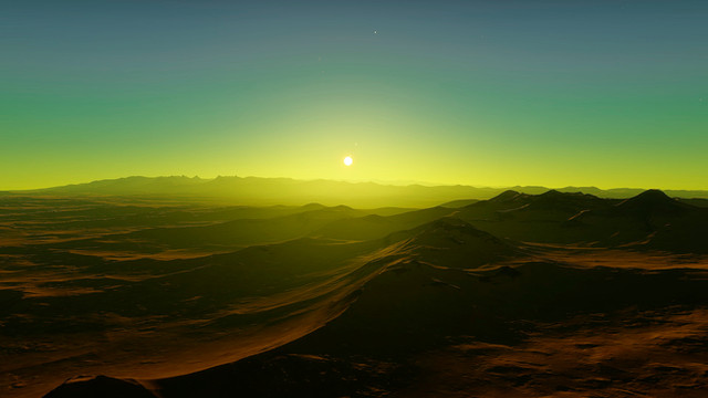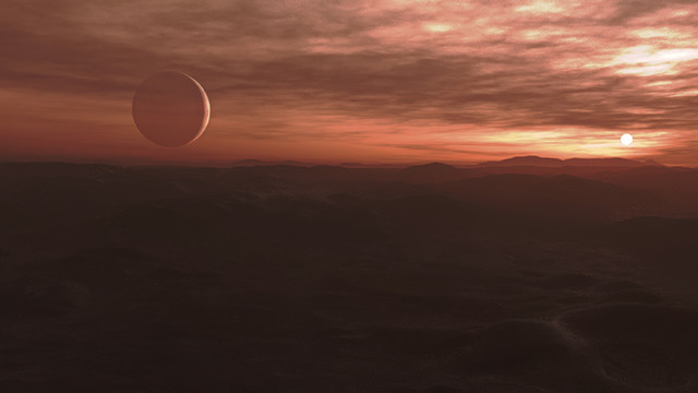 In many places on this planet it never really gets dark at night. In addition to the large moon, the red dwarf star, which is also faintly visible during the day, shines a lot brighter than Venus in Earth's night sky.