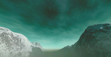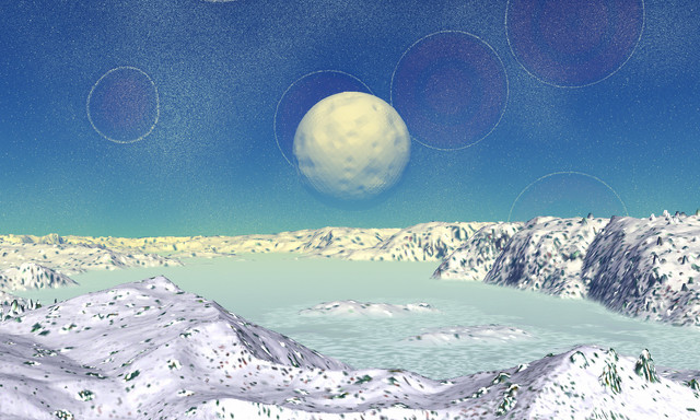 The eccentric orbit of the planet shown here lies in the habitable zone, but is characterized by extreme climatic conditions that have prevented the development of higher life until now. Lichen-like and moss-like plants and other lower life forms dominate the tundra-like landscape. The planet is presently recovering from the annual "orbital winter," a planet-wide "little ice age," and is preparing for the short, hot summer.