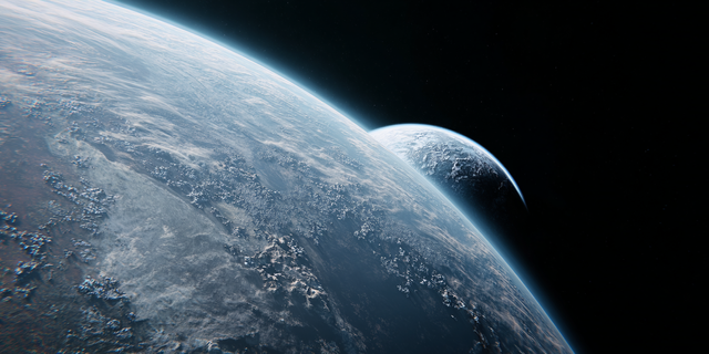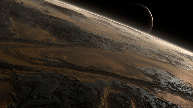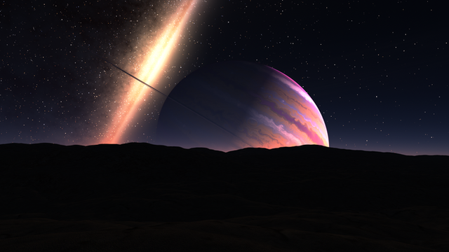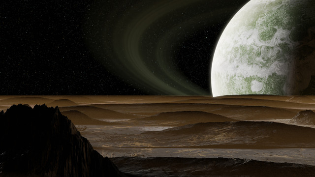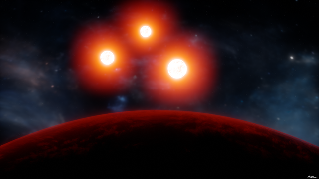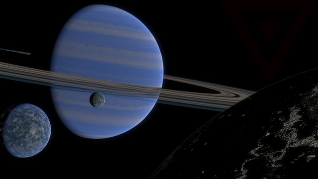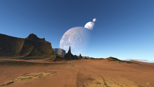 Here, a large Jupiter-like gas giant orbits its two parent stars at a great distance. The two small moons visible in the image also orbit around their common center of gravity and both in turn orbit around the gas giant with other moons.