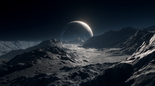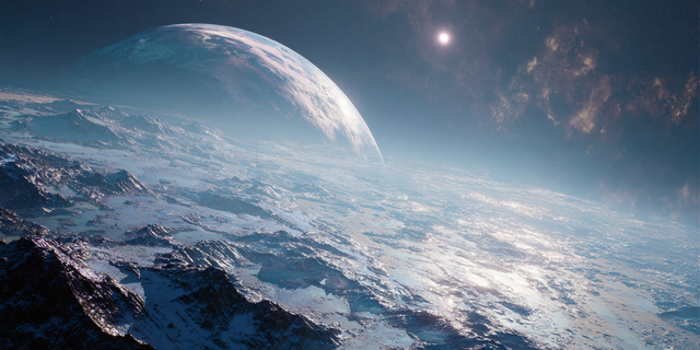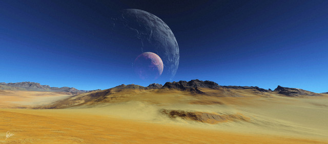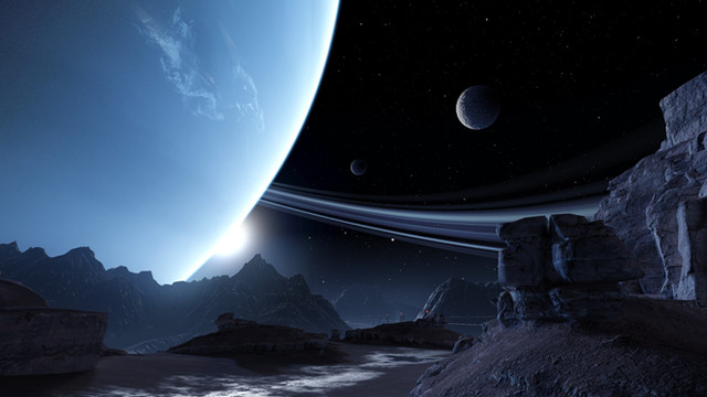 The inhabitable moon of a water covered Super Earth orbiting a young Class A main sequence star, part of a triple system with two red dwarfs, visible over the horizon.