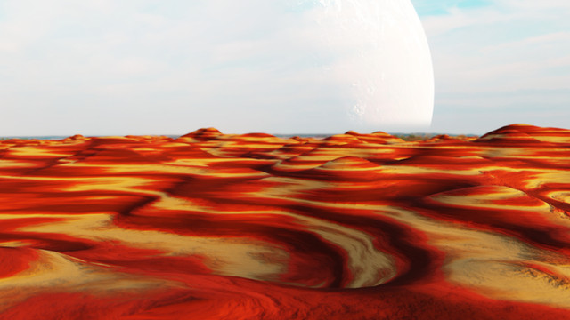 This world is slightly larger and more massive than Earth, a "Super-Earth." It has no moon, but a thin ring of smaller asteroids left over from the formation of the planet. The orbits of these asteroids have meanwhile aligned and stabilized. Nevertheless (geologically seen) impacts occur more often than on Earth. The bigger ones can have effects on the whole planet. The planet is now 3 billion years old, but life has not yet progressed beyond the stage of simple life forms. Larger asteroid impacts from the ring keep preventing life forms from evolving.